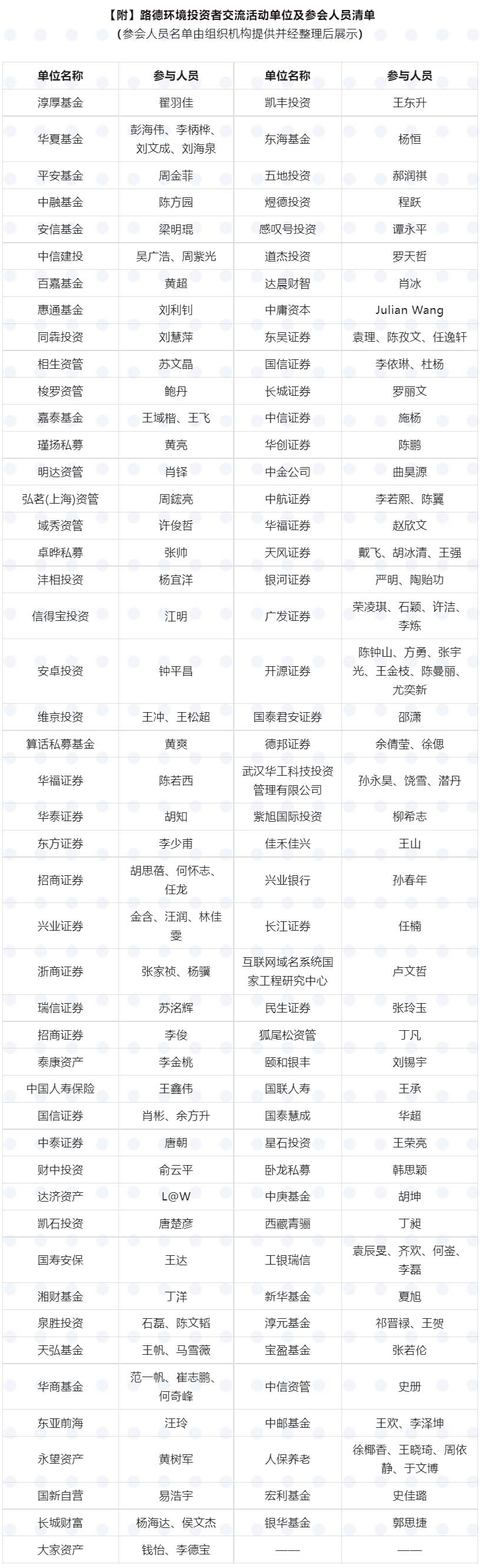 2023年4月28日-5月12日,路德環(huán)境組織了多場線上、線下投資者交流活動,與中信證券、中信建投證券、銀河證券、浙商證券、東吳證券、中航證券、天風證券、建銀理財、明達資產(chǎn)、永望資產(chǎn)等90余家機構進行了深入溝通。