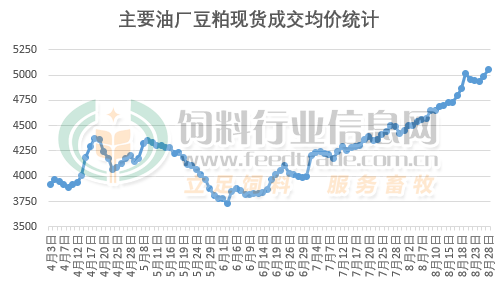 據(jù)飼料行業(yè)信息網(wǎng)數(shù)據(jù)顯示:8月28日,國(guó)內(nèi)豆粕市場(chǎng)均價(jià)突破5000元/噸大關(guān),創(chuàng)下了自6月份觸底反彈以來(lái)的新高。