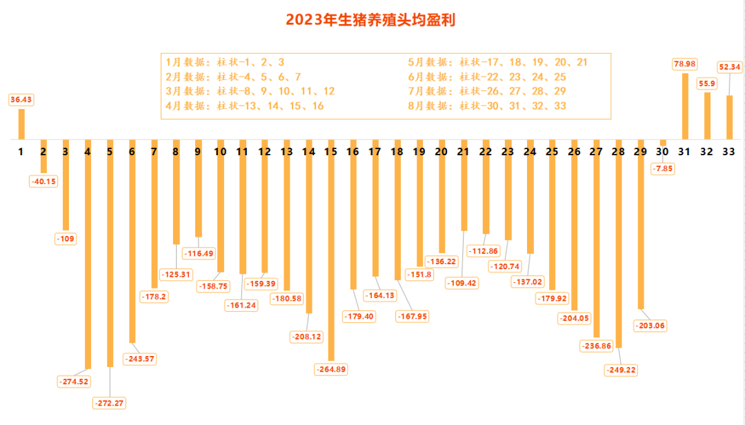 2023年以來(lái),我國(guó)生豬養(yǎng)殖頭均盈利狀況 數(shù)據(jù)來(lái)源:發(fā)改委價(jià)格監(jiān)測(cè)中心、卓創(chuàng)資訊
