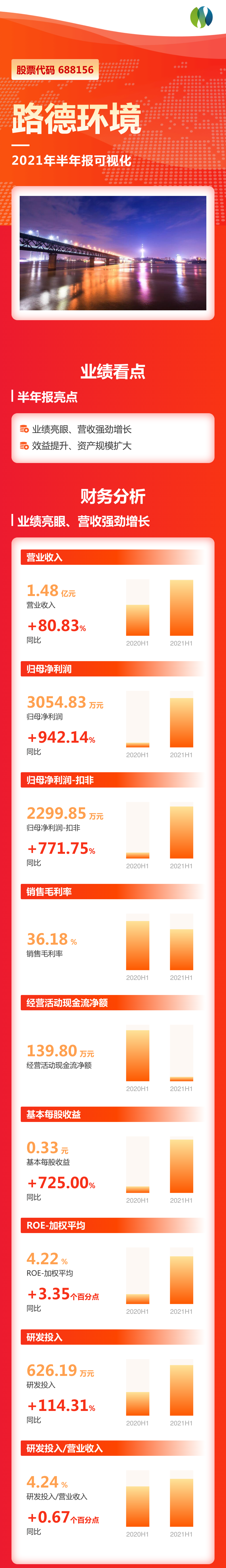 8月19日,路德環(huán)境發(fā)布2021年半年報(bào),上半年,公司實(shí)現(xiàn)營(yíng)業(yè)收入14785.15萬(wàn)元,同比增長(zhǎng)80.83%;歸屬于上市公司股東的凈利潤(rùn)3054.83萬(wàn)元,同比增長(zhǎng)942.14%。